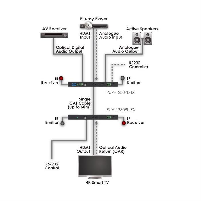 Übertragung von Audio, Video bis 4K HDCP 2.2, PoH und einem bidirektionalen Steuersignal (IR) über ein Cat5e-Kabel (max. 60 m). Unterstützt Optical Audio Return (OAR).