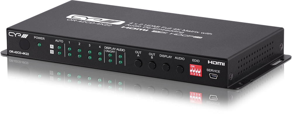Die OR-42CD-4K22 ist eine 4x2 HDMI-Matrix. 4 HDMI-Eingänge können auf 2 verschiedene HDMI-Ausgänge geschaltet werden. Separate Autoswitch-Funktion pro Ausgang möglich.