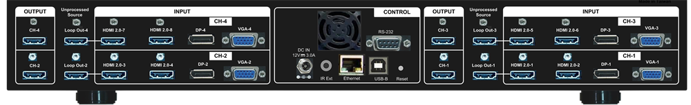 Jeder der vier Kanäle verfügt über vier Eingänge (2×HDMI 2.0, DP 1.2, VGA) und unterstützt Auflösungen bis 7680×2160 @30Hz oder 4096×2160 @60Hz bei 4:4:4 Farbabtastung. Die HDMI-Ausgänge liefern WUXGA/2048×1080 @60Hz und ermöglichen dank HDMI-Loop-Out große Daisy-Chain-Konfigurationen.
