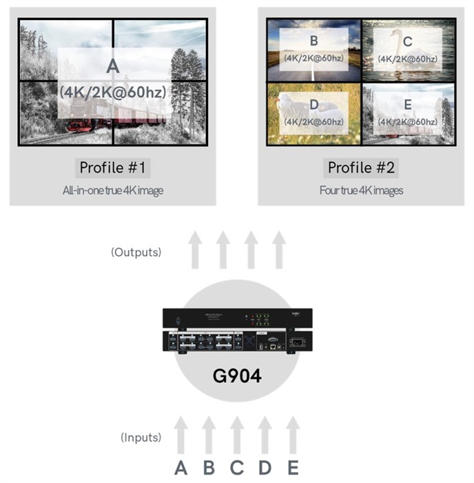 Der G904 verarbeitet Signale bis 7680×2160/30 oder 4096×2160/60 in 4:4:4 und bietet programmierbare 4K-Ausgänge bis 4096×2267/60 oder 7680×1234/60. Jede Zone lässt sich individuell croppen, skalieren, rotieren (0/90/180/270°), spiegeln und farblich feinabstimmen – ideal für unkonventionelle LED-Layouts, kreative Monitor-Arrays oder Mixed-Orientation-Videowände (siehe Beispiele ab Seite 8–12).