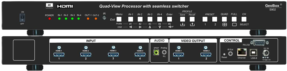 Die Steuerung erfolgt über Frontpanel, IR-Fernbedienung, P-100-Controller, WebGUI, PC-Software, RS232, USB oder Netzwerk. Damit lässt sich der S902 mühelos in automatisierte AV-Systeme integrieren.
