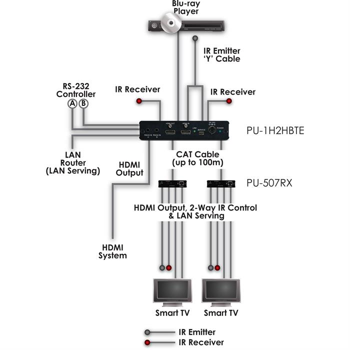 1 entrée HDMI est distribuée sur 2 sorties HDBaseT, cascadable grâce à la sortie HDMI supplémentaire.