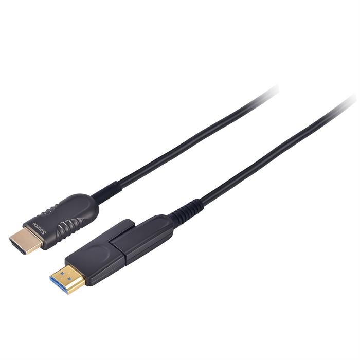Câble HDMI optique actif (AOC) de 100 mètres, conforme à la norme HDMI 2.0 avec 4K@60Hz 4:4:4 et HDR avec 18 Gbit/s, conception hybride fibre optique/cuivre, aucune alimentation externe requise, adaptateur miniHDMI vers HDMI amovible unilatéral pour insertion facile dans les tubes électriques existants (25mm), aide au tirage, livré dans un carton pratique avec dérouleur. Classification CPR selon EN 13501-6:Cca-s1,d0