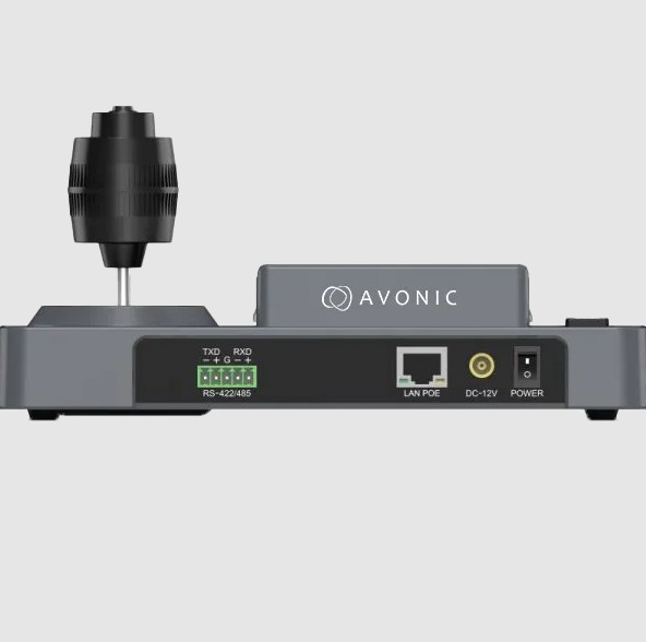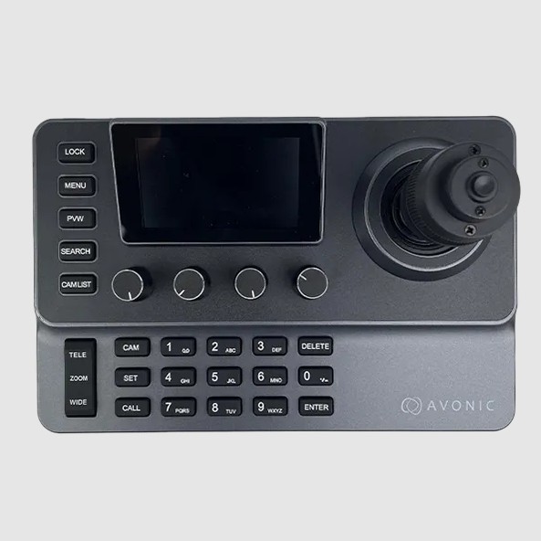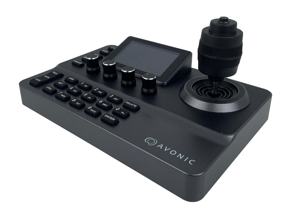 L'Avonic CON200-IP est un contrôleur de caméra PTZ compact équipé d'un joystick 4D, d'un écran LCD 3 pouces et d'une alimentation PoE.
