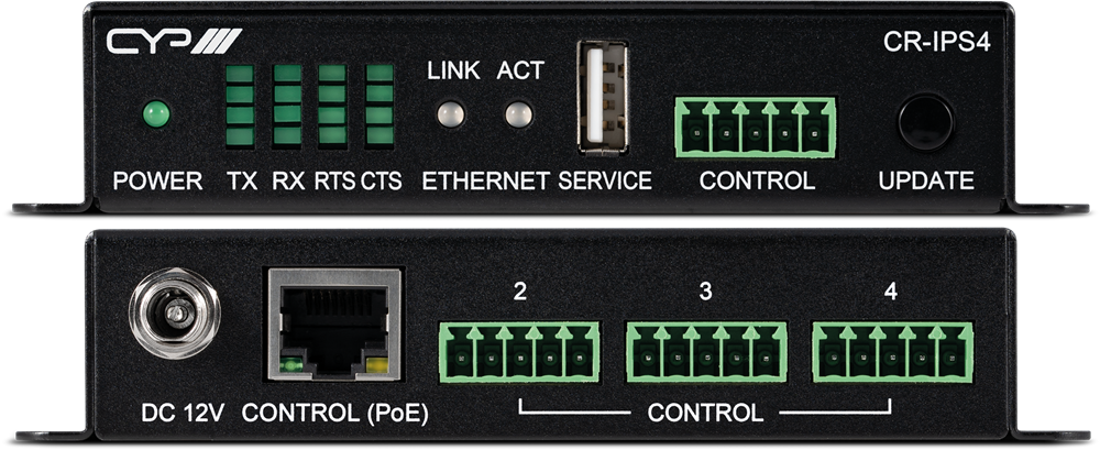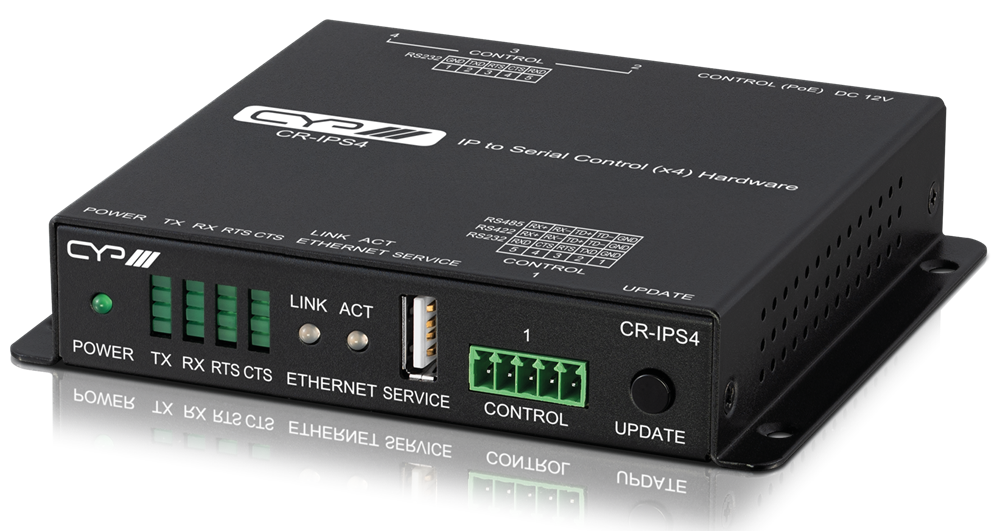 Il CR-IPS1 è un convertitore da IP a seriale con 4 porte seriali e serve per il controllo IP/Telnet a seriale di 4 dispositivi seriali (1 x RS-232/422/485 e 3 x RS-232.