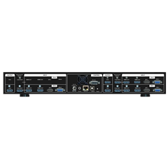 Ogni canale dispone di quattro ingressi (2×HDMI 2.0, DP 1.2, VGA) e supporta risoluzioni fino a 7680×2160 @30Hz o 4096×2160 @60Hz con campionamento 4:4:4. Le uscite HDMI raggiungono WUXGA/2048×1080 @60Hz e il Loop-Out permette configurazioni in cascata su ampie superfici di proiezione.